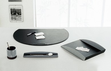 Schwarze Schreibunterlage mit schwarzem Kunstledereinsatz.
